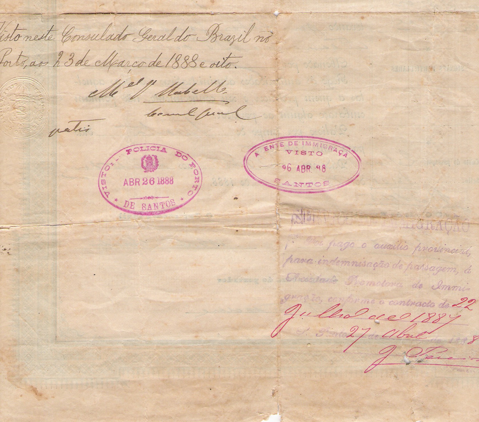 A partir de meados do século XIX o perfil do imigrante português sofreu uma radical transformação: entre os que chegavam predominavam os de origem pobre; as mulheres passaram a representar parcelas cada vez maiores dos grupos de emigrantes, e as crianças menores de 14 anos pobres, órfãs ou abandonadas, chegaram a representar 20% do total de emigrados. *Vejam o passaporte de entrada no Brasil de minha bisavó materna - Anna Diaz de Oliveira. Observem a data da chegada (antes da abolição da escravatura) . Clique aqui - Vejam o verso do mesmo passaporte. Observem que, não muito legível, está o carimbo do Serviço de Imigração em São Paulo, comprovando o pagamento indenizatório da passagem para o Brasil. Clique aqui