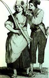 culottes " Não só os trajes refletiam o desejo de igualdade entre o homem e a mulher, como também mudavam o desejo da igualdade entre as classes sociais . No antigo Regime, as classes sociais eram bem diferenciadas: cada uma tinha modas bem caracterizadas. Os nobres usavam “culottes” de cavalgar, enquanto os homens do povo usavam calças compridas (pantalons) como os que se usam hoje. Às vésperas da Revolução, alguns nobres, a pretexto de simplicidade, e democratismo, deixaram de usar culottes. Esta tendência cresceu tanto, que o uso de culottes passou a ser o símbolo de idéias aristocráticas e contra-revolucionárias, enquanto que os "pantalons" se transformaram em símbolo de mentalidade revolucionária e igualitária. Daí a denominação de “sans culottes “ dada aos revolucionários.